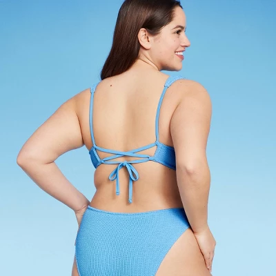 Square-neck bralette bikini top from Wild Fable⢠in a solid color with pucker texture. Made of a soft, stretchy fabric and comfy lining with removable cups. Crisscross back with string tie fastening completes the look with a customizable fit.